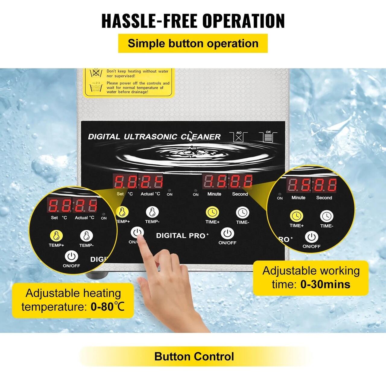 Curatare eficienta: Cu o putere de incalzire de 200 W, aparatele de curatare cu ultrasunete puternice produc unde ultrasonice de 40.000 Hz pentru curatarea eficienta a petelor aderente la metale, materiale plastice, sticla etc., fara a deteriora obiectele.