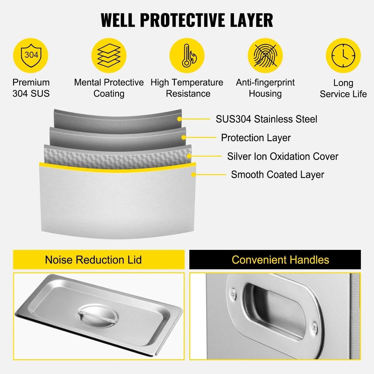 MATERIAL SUS304 PREMIUM - Dimensiune rezervor: 6L/1,59 Gal; Putere cu ultrasunete: 180W; Putere de incalzire: 300W. Acest aparat de curatat cu ultrasunete este construit din otel inoxidabil 304 robust, asigurand evitarea scurgerilor de apa si o durata lunga de viata. Este disponibil un cos in forma de sfera pentru a reduce coliziunea dintre obiectele ascutite si rezervor.
