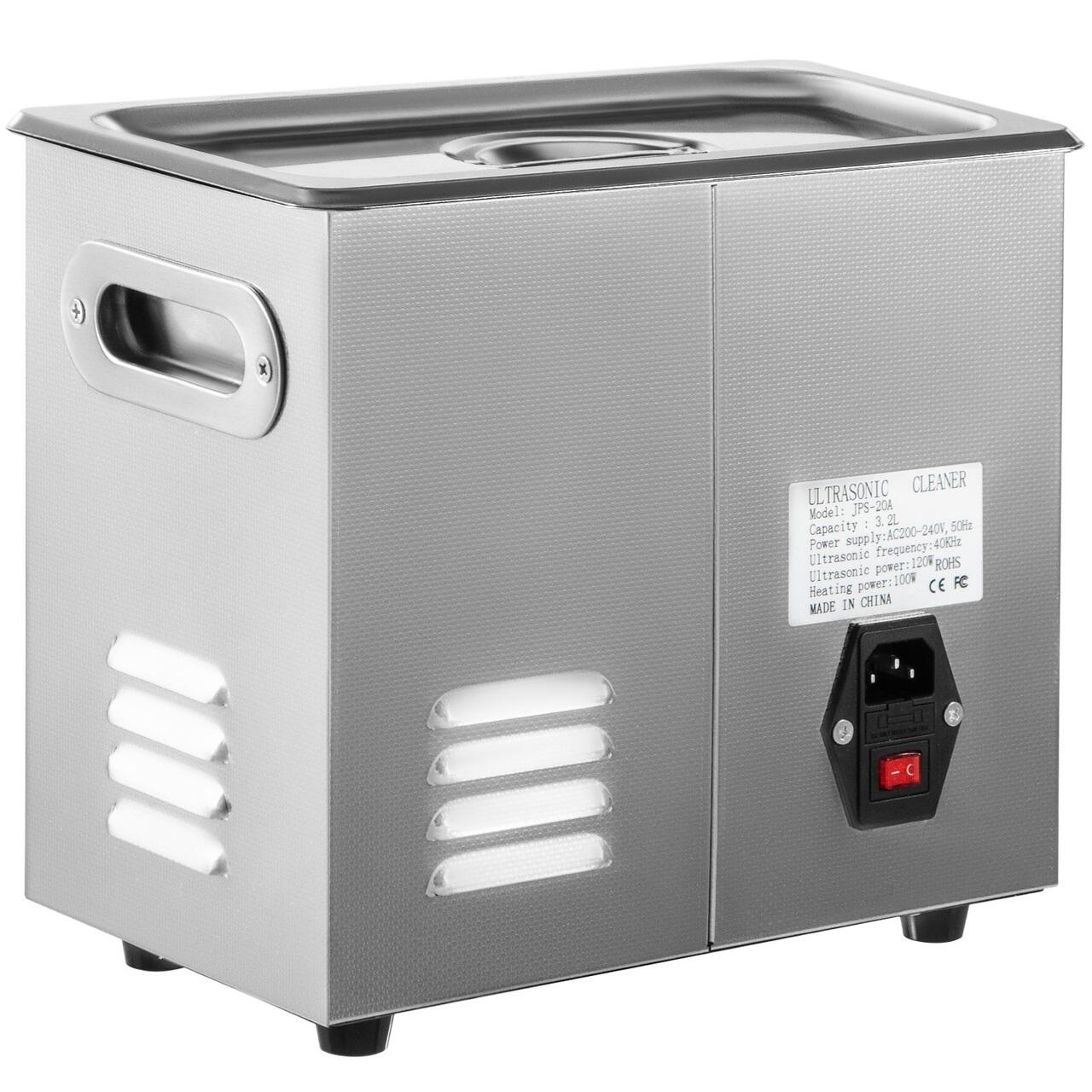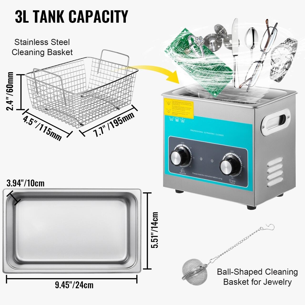 MATERIAL SUS304 PREMIUM- Dimensiune rezervor: 3L/0,79 Gal; Putere cu ultrasunete: 120W; Putere de incalzire: 100W. Acest aparat de curatat cu ultrasunete este construit din otel inoxidabil 304 robust, asigurand lipsa scurgerilor de apa si o durata lunga de viata. Este disponibil un cos suplimentar pentru a reduce coliziunea dintre obiectele ascutite si rezervor.