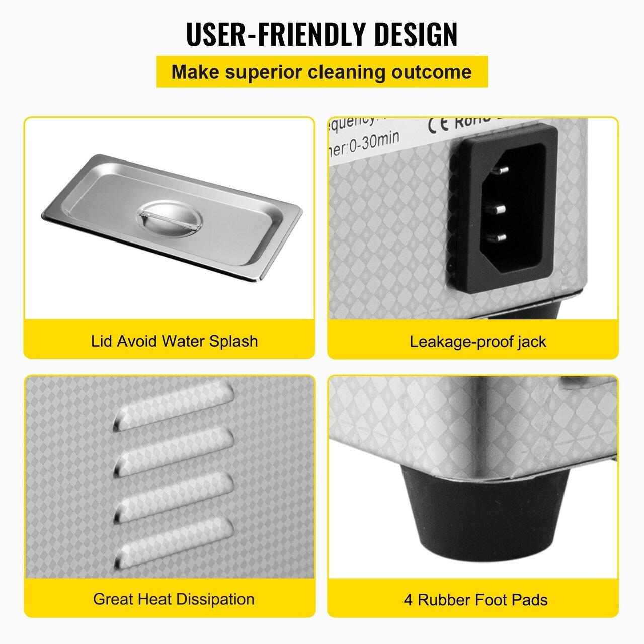 Design ușor de utilizat: Mașină de spălat cu ultrasunete de tip masă, ușoară și ușor de transportat/mutat. Este concepută pentru o utilizare mai bună de către client: coș de spălare, priză sigură, disipare a căldurii, picioare de cauciuc antiderapante și capac superior cu mâner.