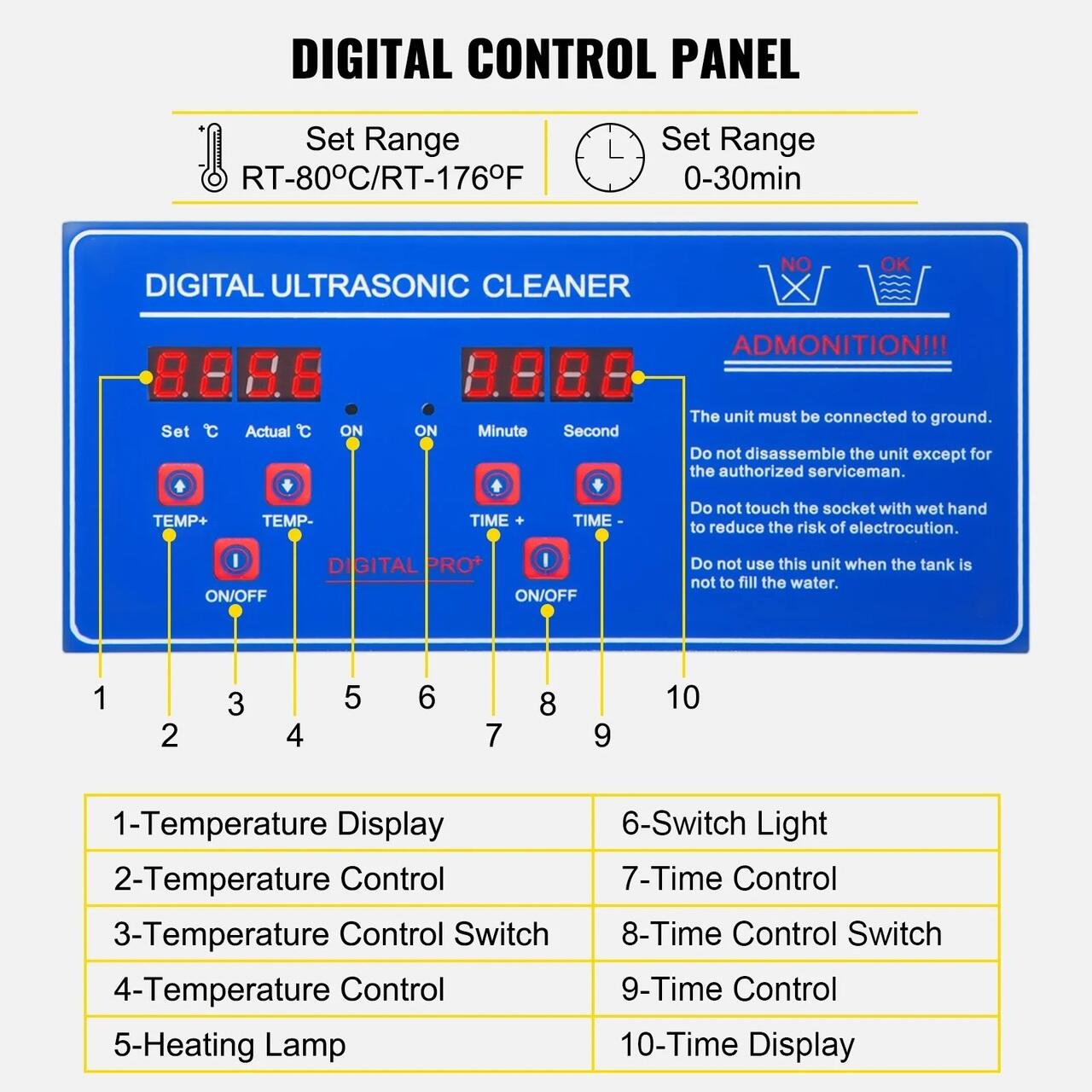 PANOU DE CONTROL DIGITAL - Aparatul cu ultrasunete pentru curatarea bijuteriilor dispune de un panou de control digital, cu un cronometru reglabil (0-30 min) si un incalzitor (RT-176℉/RT-80℃) afisat pe LED. O functie de incalzire poate inmuia si dizolva eficient petele de ulei si ceara, imbunatatind astfel efectul de curatare.
