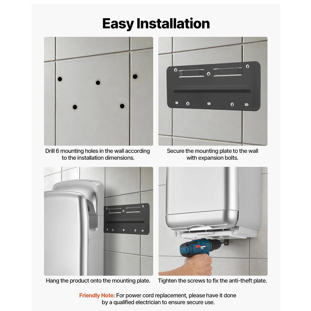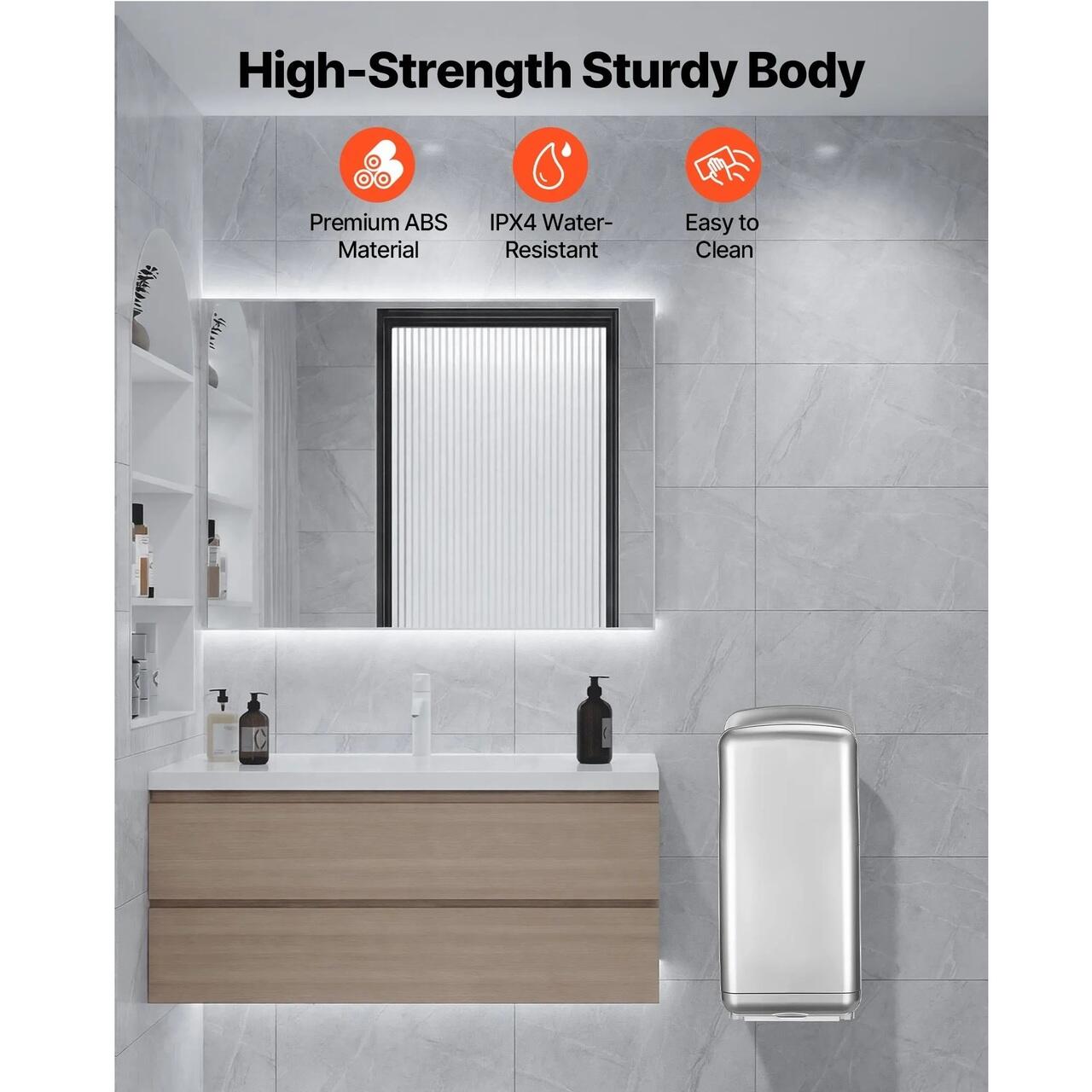 Durabil si rezistent la apa: Construit din material ABS rezistent, cu o suprafata neteda si rezistenta la impact. Rezistent la coroziune si cu grad de impermeabilitate IPX4, acest uscator de maini cu aer este conceput pentru utilizare pe termen lung in zone umede din baie.