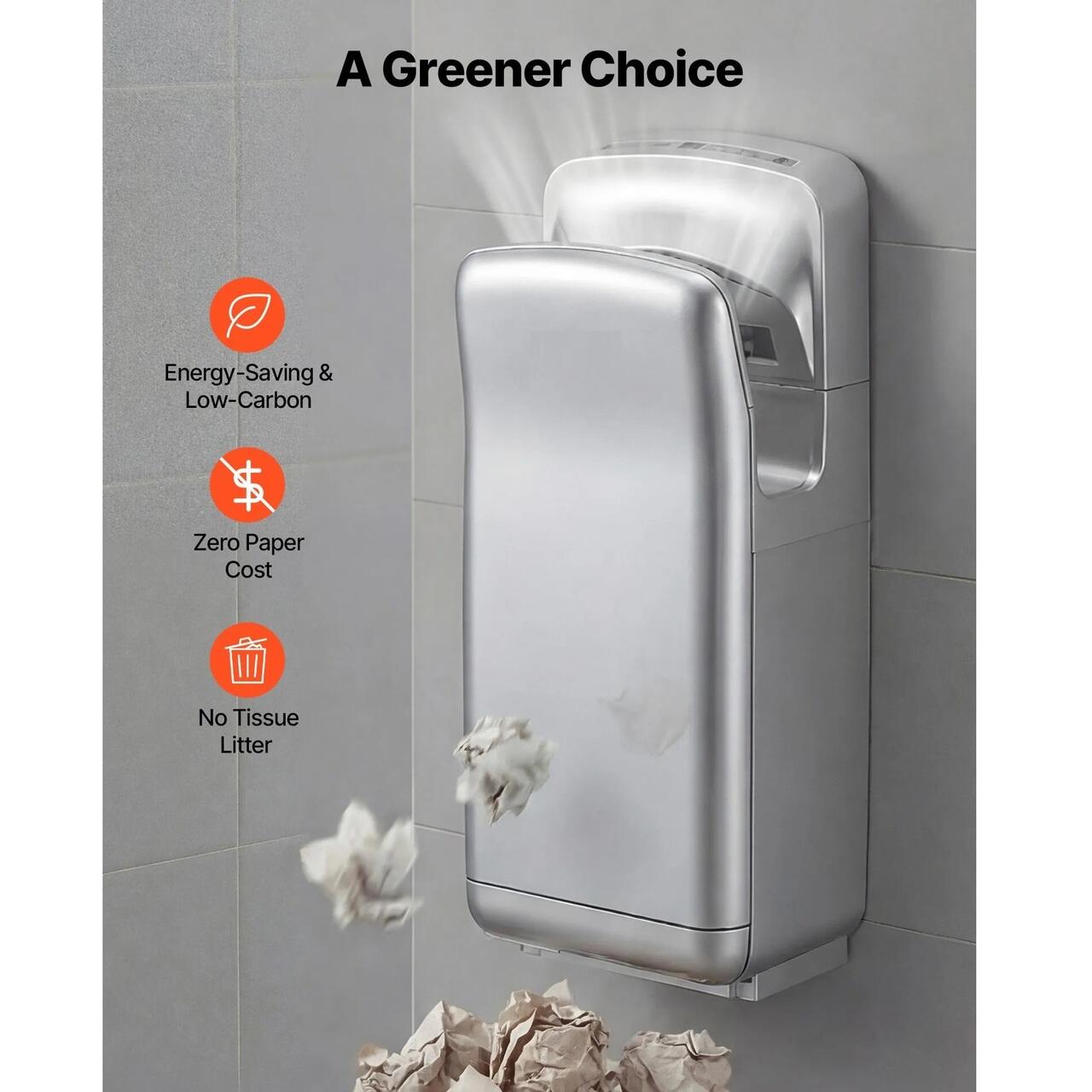 Design usor de utilizat: Senzorii infrarosii cu doua laturi se activeaza instantaneu. Fluxul de aer pe doua axe reduce stropirea si pierderile de aer. Acest uscator de maini pentru baie are un rezervor de apa detasabil de 700 ml, un comutator de alimentare ascuns si oprire automata in 30 de secunde.