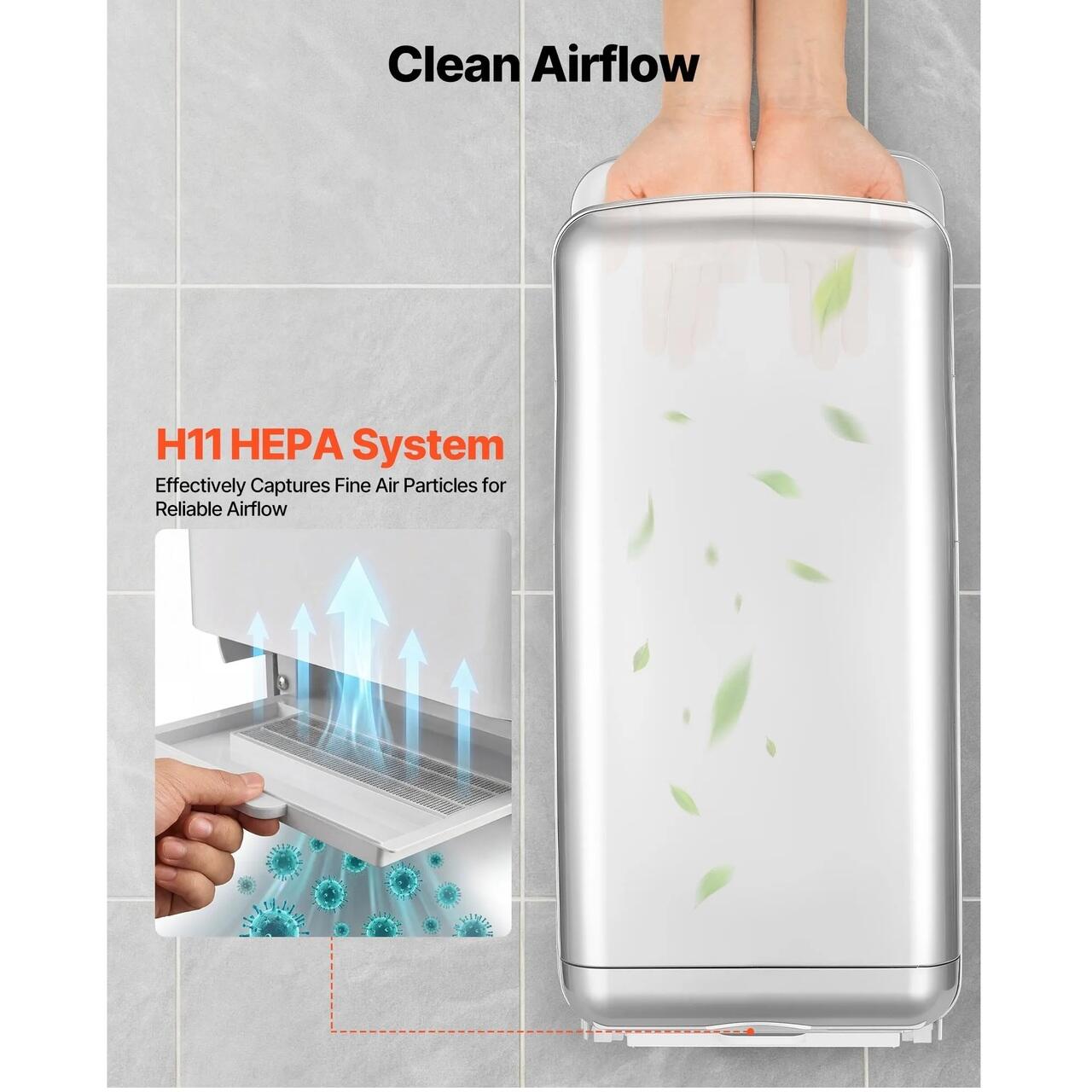 Protectie igienica a aerului: Sistemul de filtrare HEPA incorporat creeaza conditii de uscare mai curate. Ionii negativi cu concentratie ridicata ajuta la improspatarea aerului din jur, facand din acest uscator de maini o solutie fiabila pentru spatiile publice si comerciale.