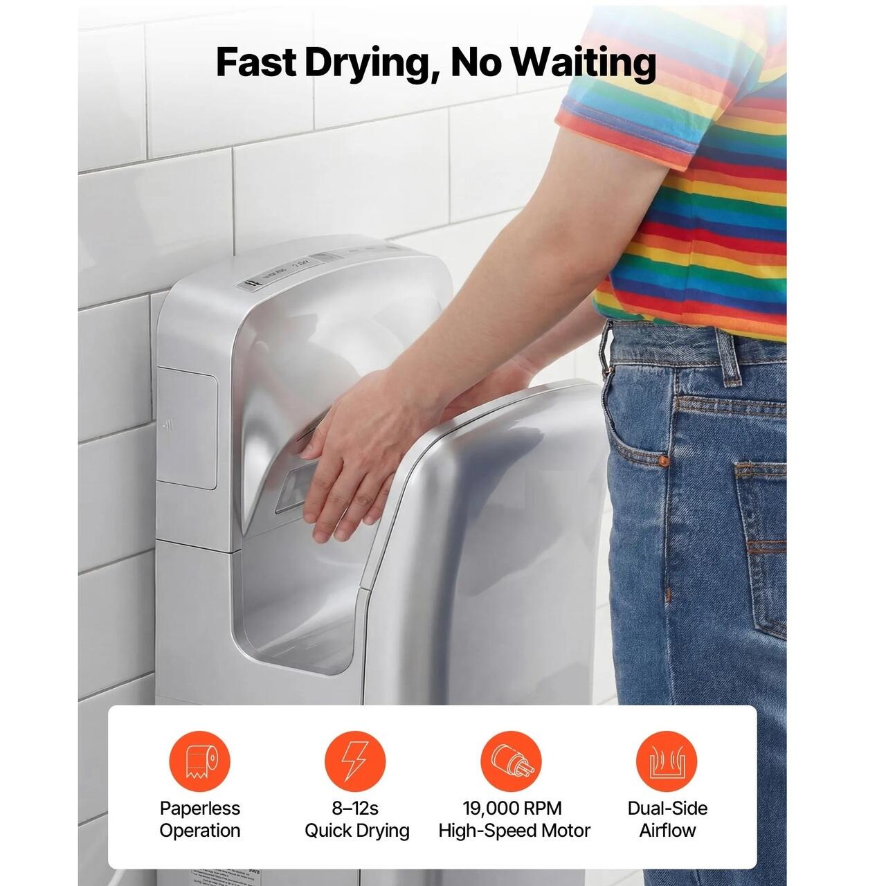 Putere de uscare rapida: Uscare de mare viteza cu AC 200–240V, 50/60Hz si putere de 1950W. Echipat cu un motor de 19.000 RPM si un flux de aer de pana la 100 m/s, acest uscator de maini vertical ofera uscare cu aer cald in doar 8–12 secunde, reducand timpul de asteptare in toaletele aglomerate.