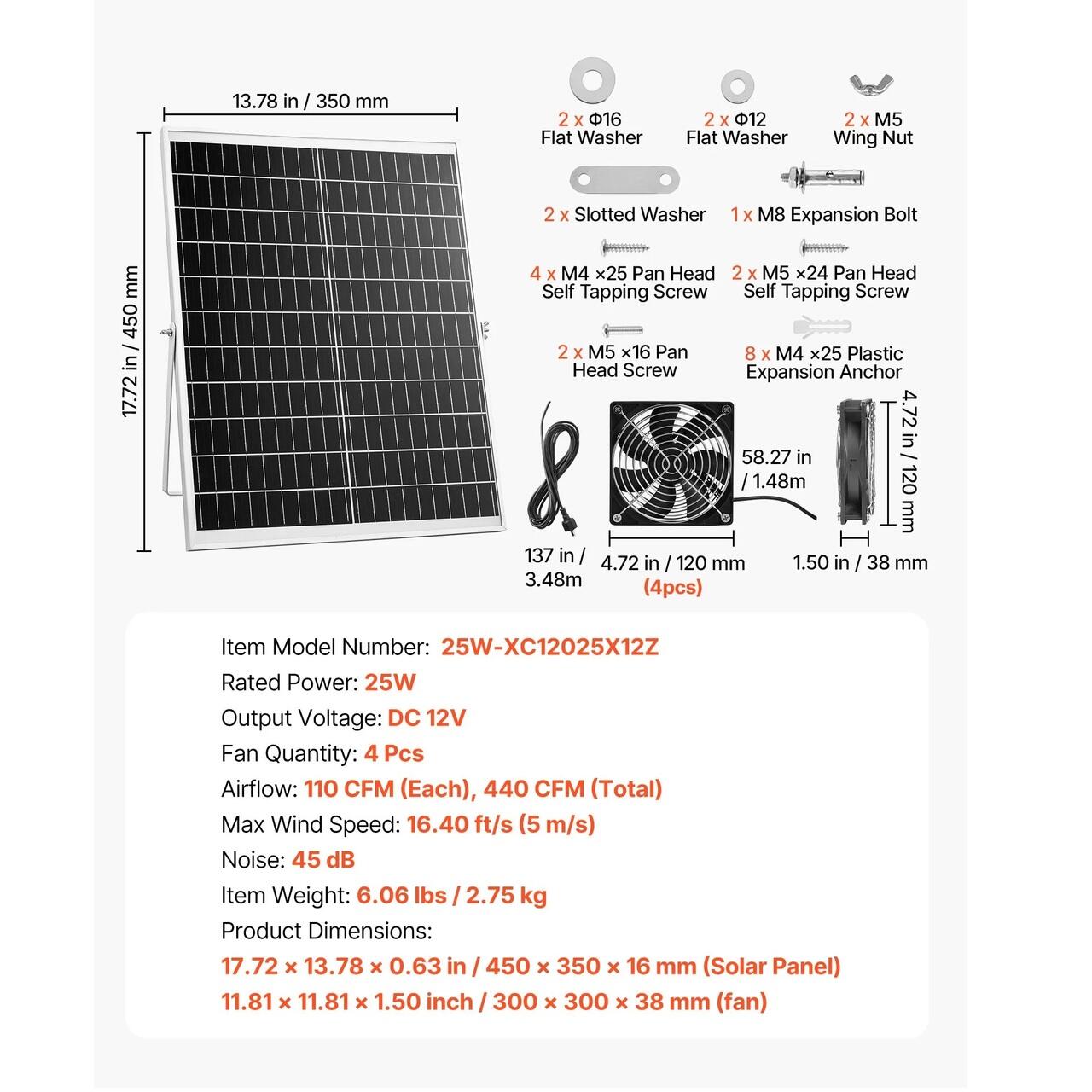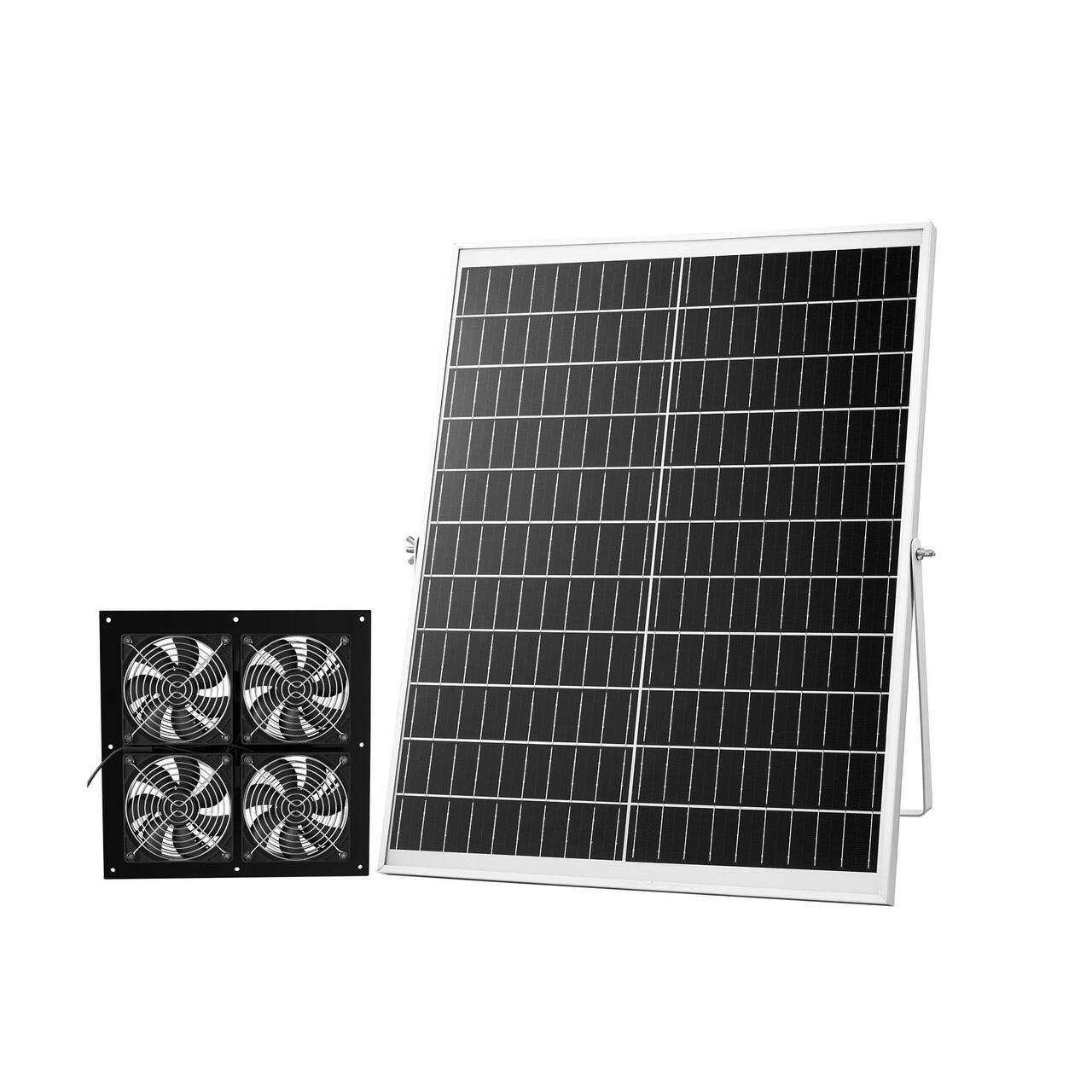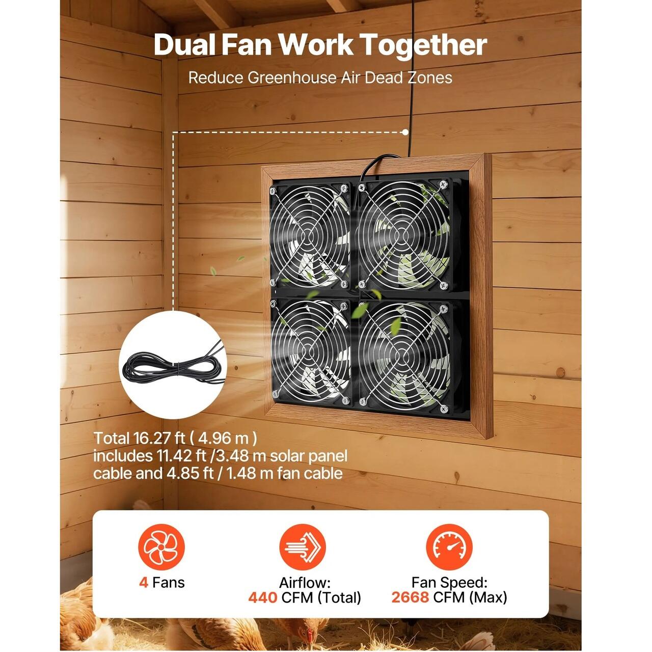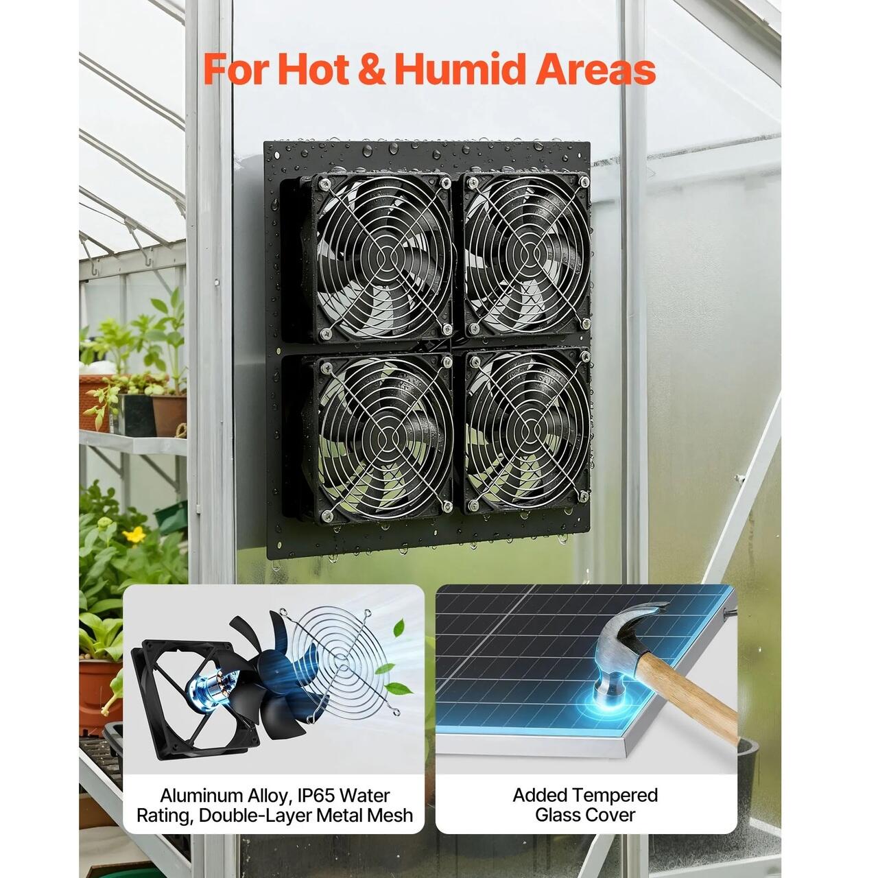 Circulatie a aerului cu doua ventilatoare: Patru ventilatoare CC de mare viteza furnizeaza un flux de aer total de pana la 440 CFM in lumina puternica a soarelui, contribuind la accelerarea schimbului de aer in spatii inchise sau semi-inchise. Conceput pentru ventilatie eficienta ca ventilator solar de evacuare.