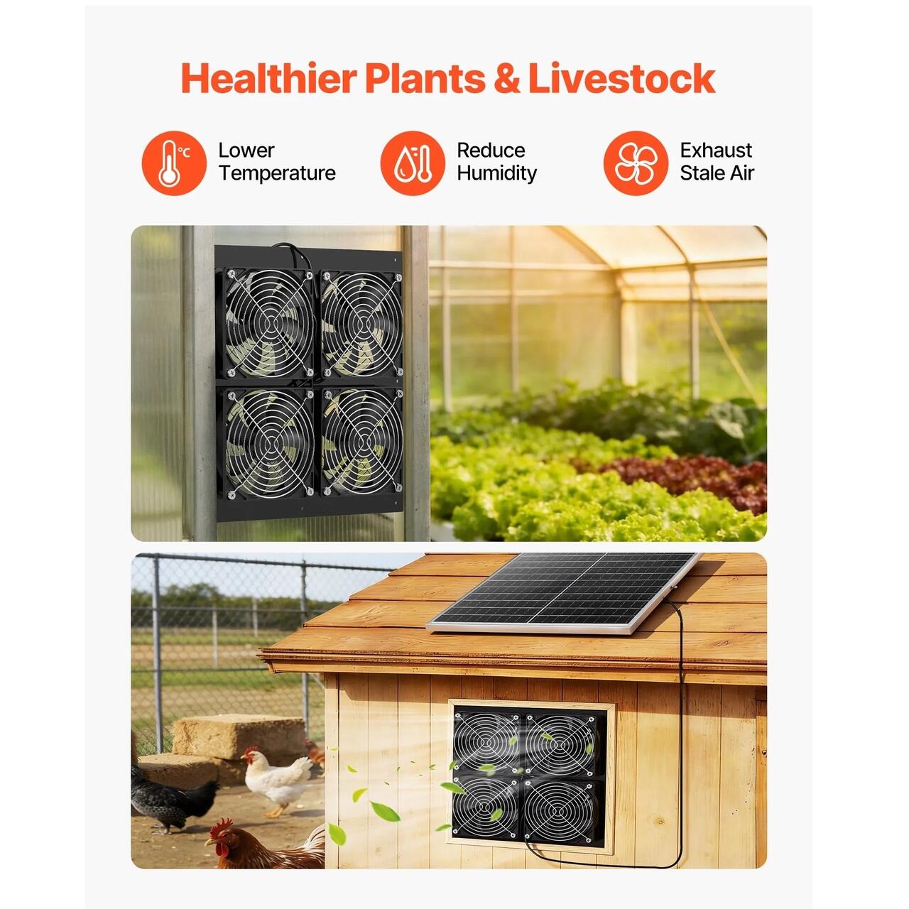 Functionare cu energie solara: Panou solar de 25W cu conector direct de curent continuu alimenteaza automat ventilatorul cu energie solara in lumina soarelui. Nu este necesara conversia tensiunii sau alimentarea cu energie electrica de la retea. Potrivit pentru sere si ferme din curtea din spate, ajutand la reducerea cablurilor.