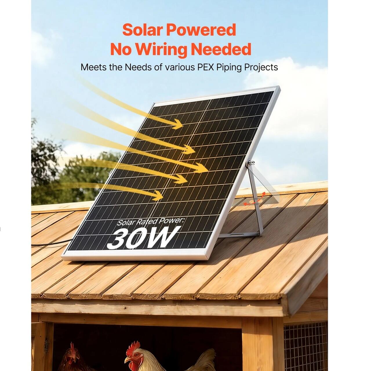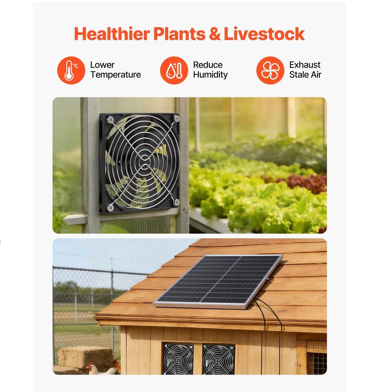 Functionare cu energie solara: Panou solar de 30 W cu conector direct de curent continuu alimenteaza automat ventilatorul cu energie solara in lumina soarelui. Nu este necesara conversia tensiunii sau alimentarea cu energie electrica de la retea. Potrivit pentru sere si ferme din curtea din spate, ajutand la reducerea cablurilor.