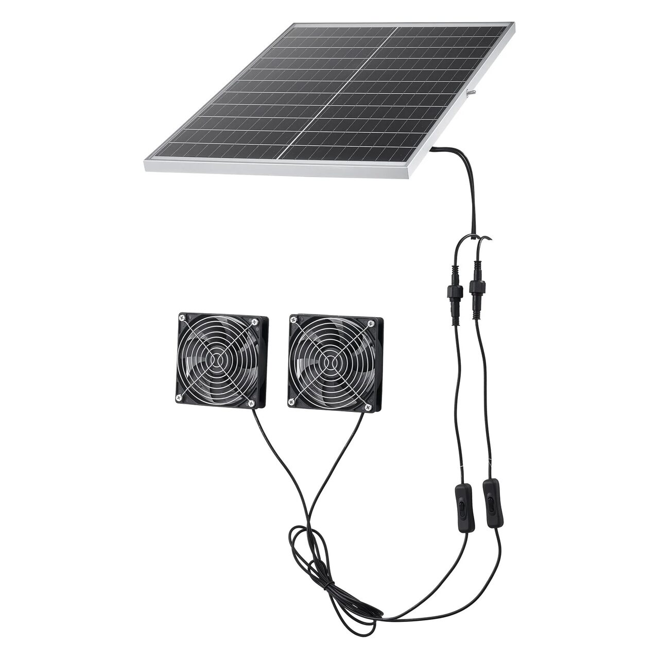 Circulatie a aerului cu doua ventilatoare: Doua ventilatoare CC de mare viteza furnizeaza un flux de aer total de pana la 400 CFM in lumina puternica a soarelui, contribuind la accelerarea schimbului de aer in spatii inchise sau semi-inchise. Conceput pentru ventilatie eficienta ca ventilator solar de evacuare.
