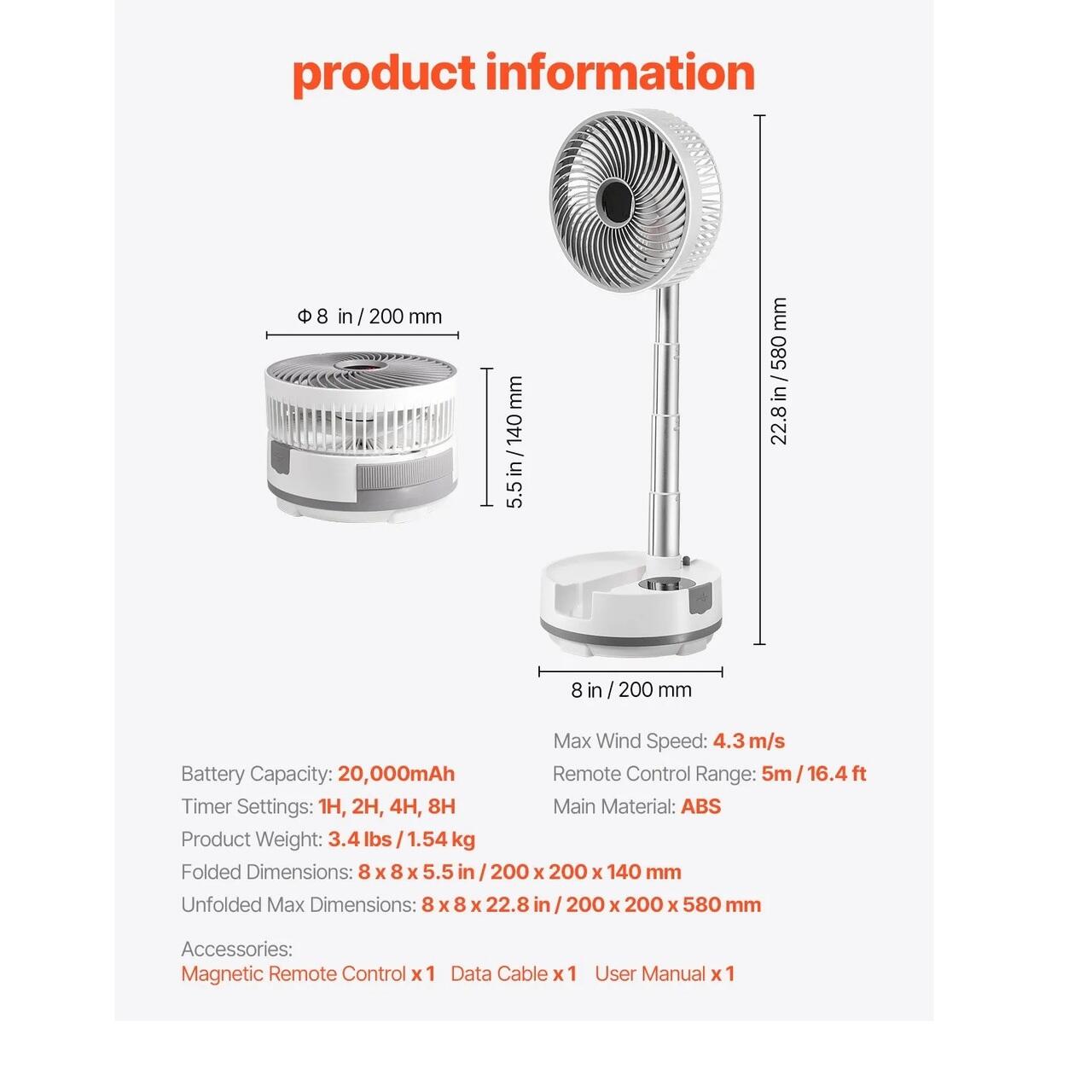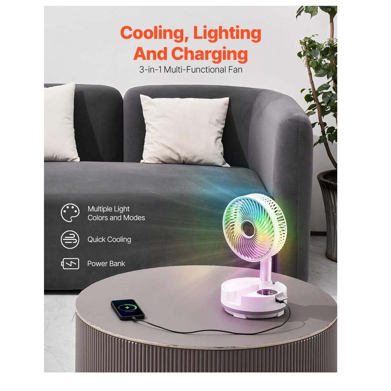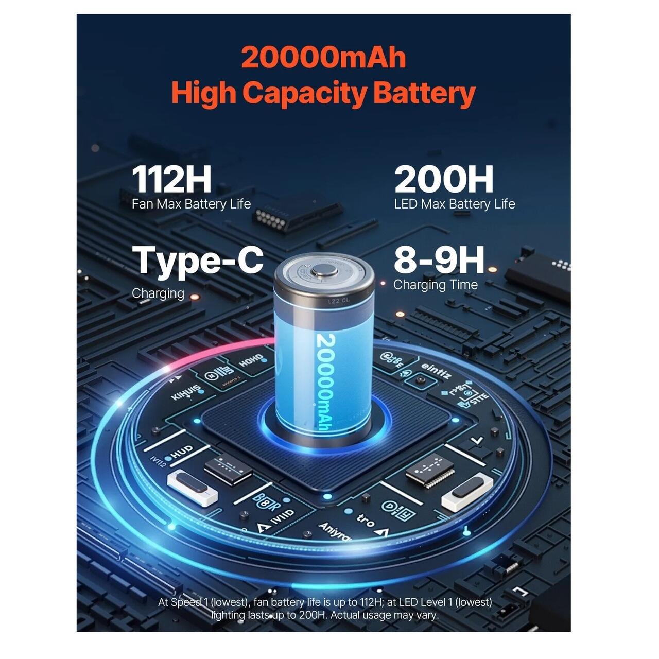 Baterie de lunga durata: Alimentat de o baterie de mare capacitate de 20.000 mAh, micul ventilator poate functiona pana la 112 ore la viteza 1 atunci cand este complet incarcat. Lumina LED la viteza 1 dureaza pana la 200 de ore. Portul de incarcare Type-C convenabil asigura o incarcare rapida si eficienta, oferind o compatibilitate puternica pentru utilizarea acasa sau in aer liber.