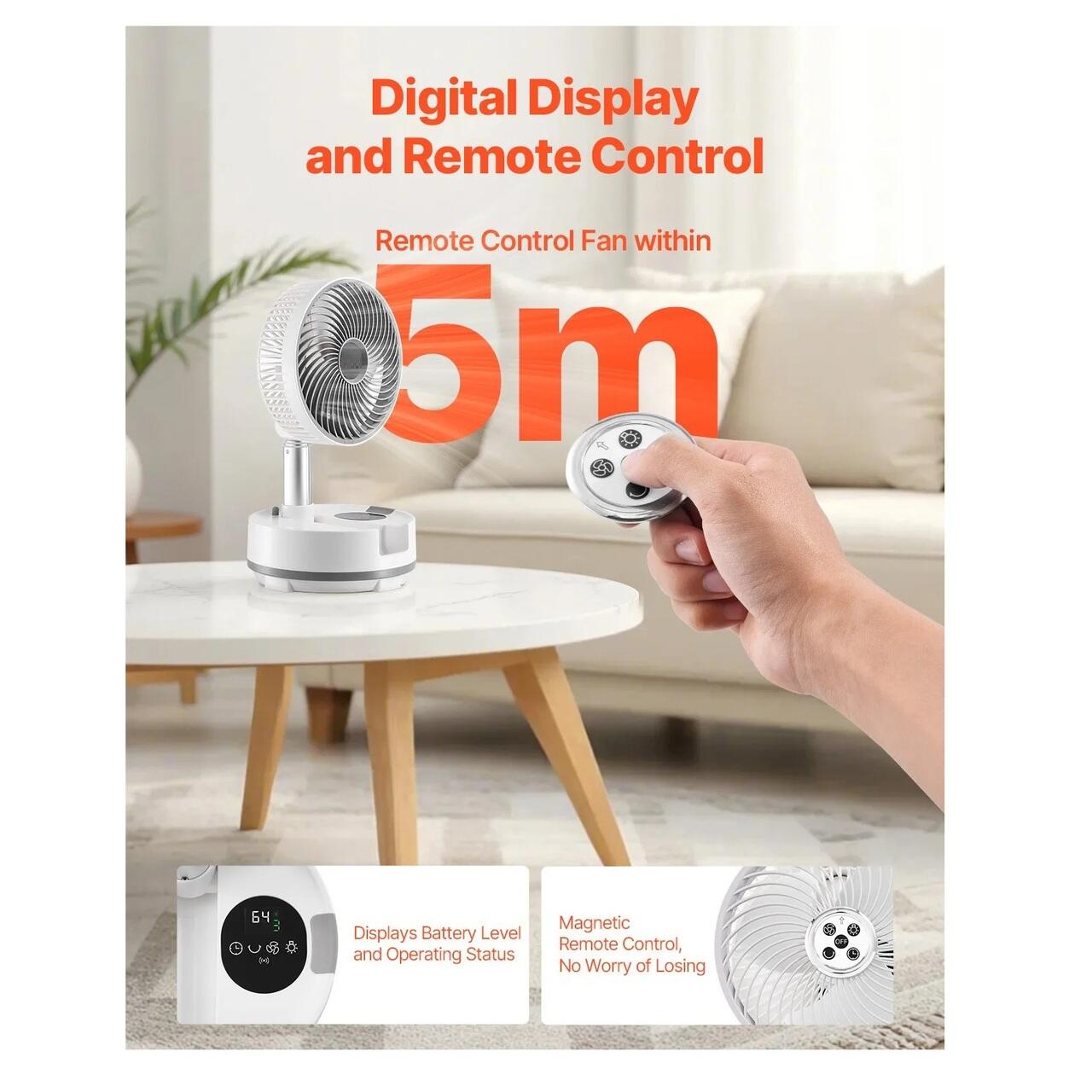 Operare si configurare usoara: Echipata cu un afisaj digital care arata clar nivelul bateriei si starea de functionare, telecomanda magnetica face operarea mai convenabila. Puteti controla cu usurinta setarile de pornire/oprire si viteza ale ventilatorului in raza de 5 metri, asigurand confort din orice pozitie. Designul magnetic unic permite atasarea telecomenzii la ventilator, evitand pierderea.