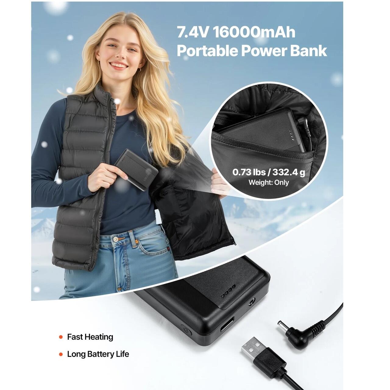 Caldura de lunga durata: Vine cu o baterie externa portabila de 7,4 V si 16000 mAh, vesta incalzita pentru femei se poate incalzi rapid pentru o perioada lunga de timp. De asemenea, functioneaza ca incarcator pentru telefon sau alte dispozitive electronice atunci cand sunteti in aer liber.
