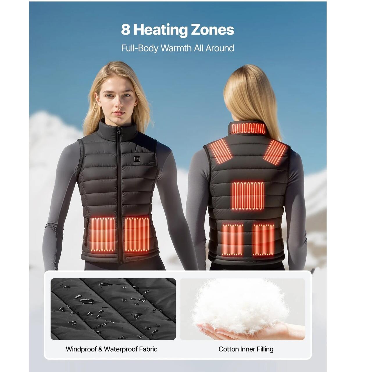 Incalzire completa a corpului: Vesta incalzita este dotata cu 8 zone de incalzire, inclusiv abdomen, talie, umeri, spate si gat. Elementele de incalzire incorporate din fibra de carbon asigura o distributie uniforma a caldurii si o incalzire rapida in zonele centrale ale corpului.