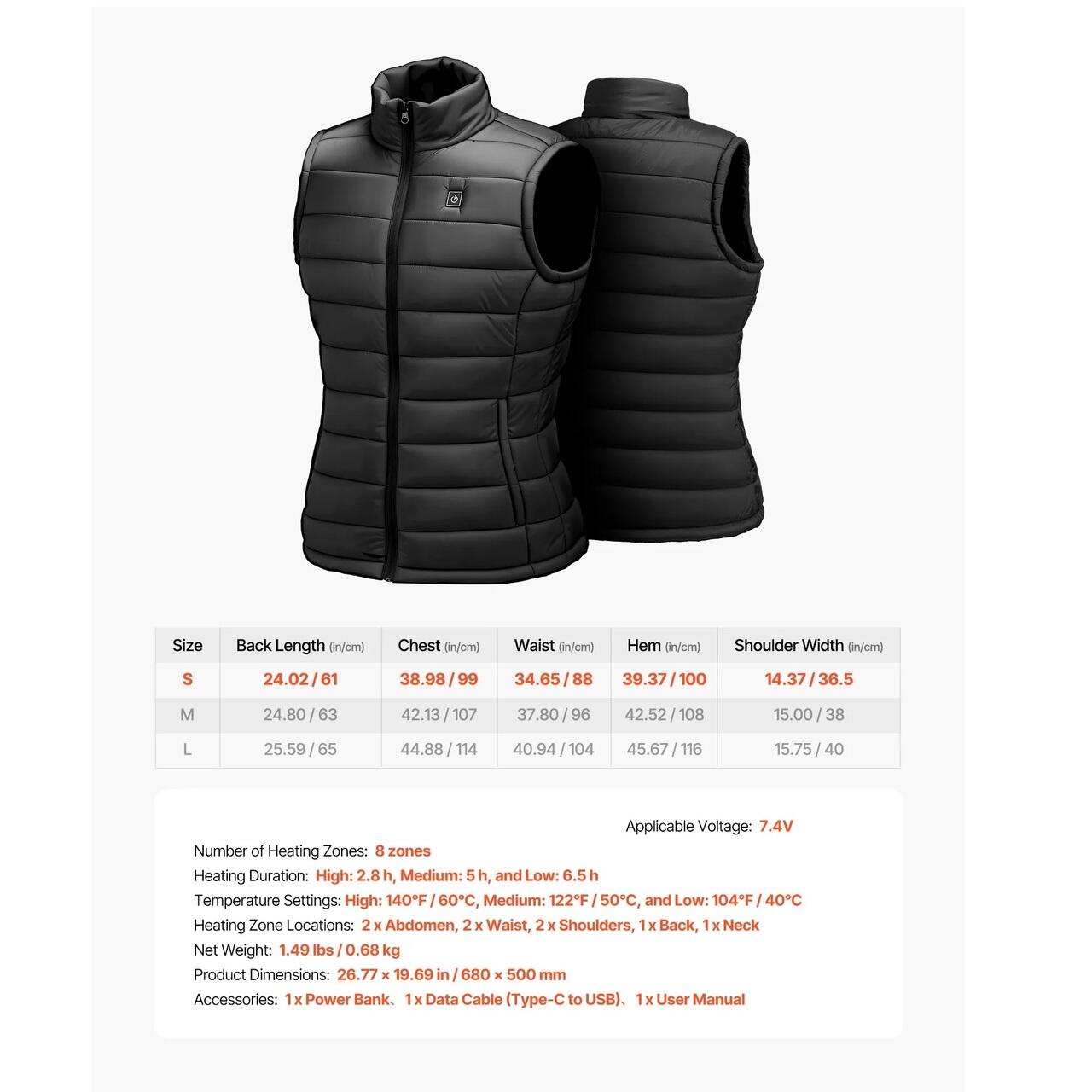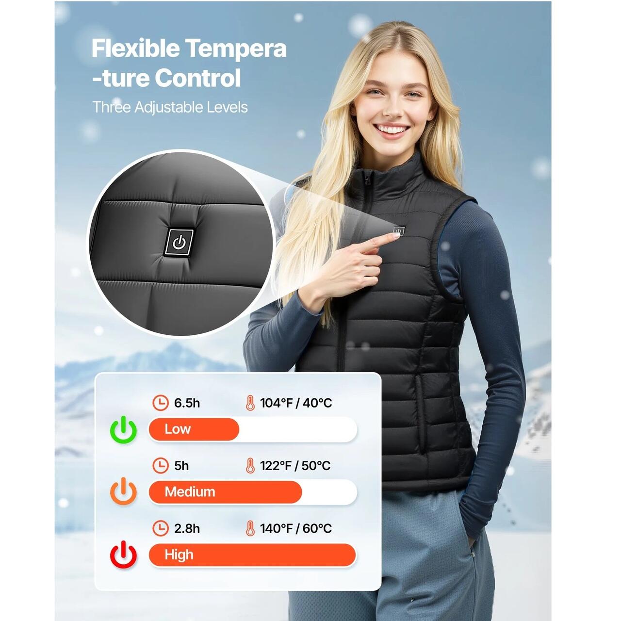 Control al temperaturii pe trei niveluri: Vesta noastra incalzita pentru femei ofera trei setari de caldura - ridicata 60 °C, medie 50 °C si joasa 40 °C. Puteti regla temperatura in mod flexibil cu un simplu buton, in functie de nevoile dumneavoastra.