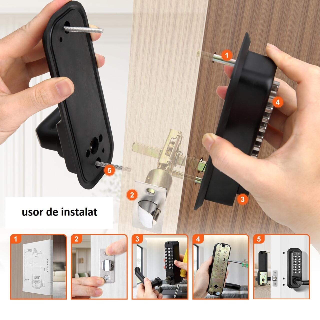 Incuietoare mecanica fara cheie Gen2: incuietoarea noastra mecanica fara cheie, cu structura sa mecanica completa, o face dificila pentru hoti. Nu este nevoie de incarcare sau baterii. Doar bucurati-va de instalare si operare usoara. Modelul actualizat face ca schimbarea parolei sa fie o usoara, iar manerele reglabile din stanga si din dreapta ofera o mai mare flexibilitate.