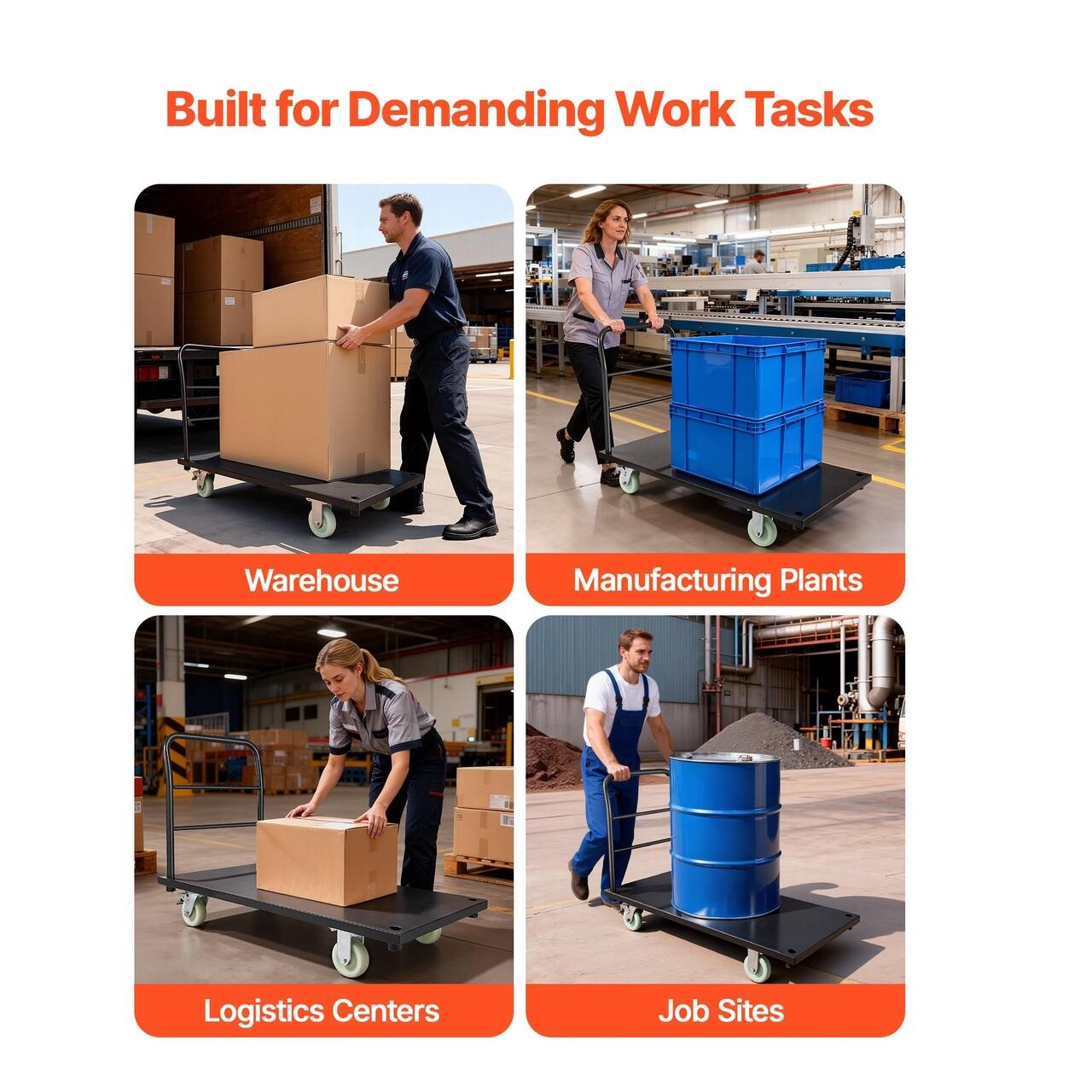 Utilizare industriala si comerciala larga: Acest carucior cu platforma si roti este ideal pentru depozite, ateliere, poduri de marfa si alte medii industriale sau comerciale. Muta cu usurinta incarcaturi grele si ajuta la imbunatatirea eficientei generale a fluxului de lucru.