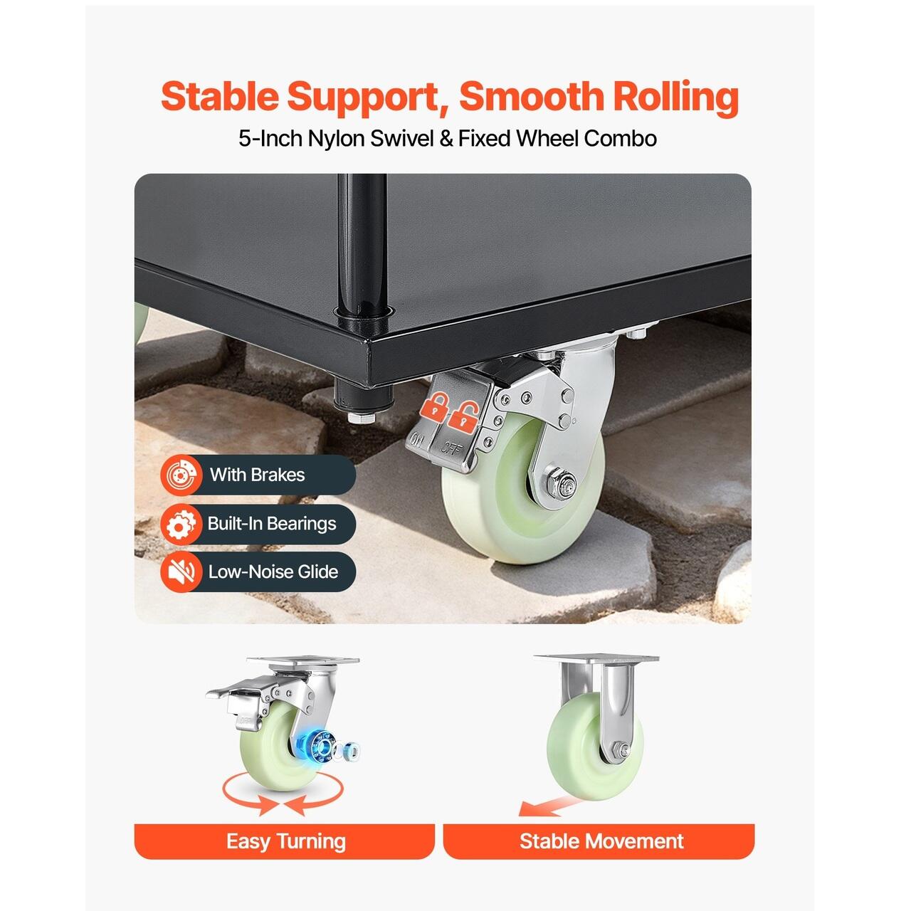 Roti din nailon, rulare lina: Echipat cu patru roti din nailon de 5 inch - doua roti pivotante cu frana de picior si doua roti fixe. Acest carucior cu platforma ofera mobilitate la 360° si functionare silentioasa, franele asigurand o parcare stabila.