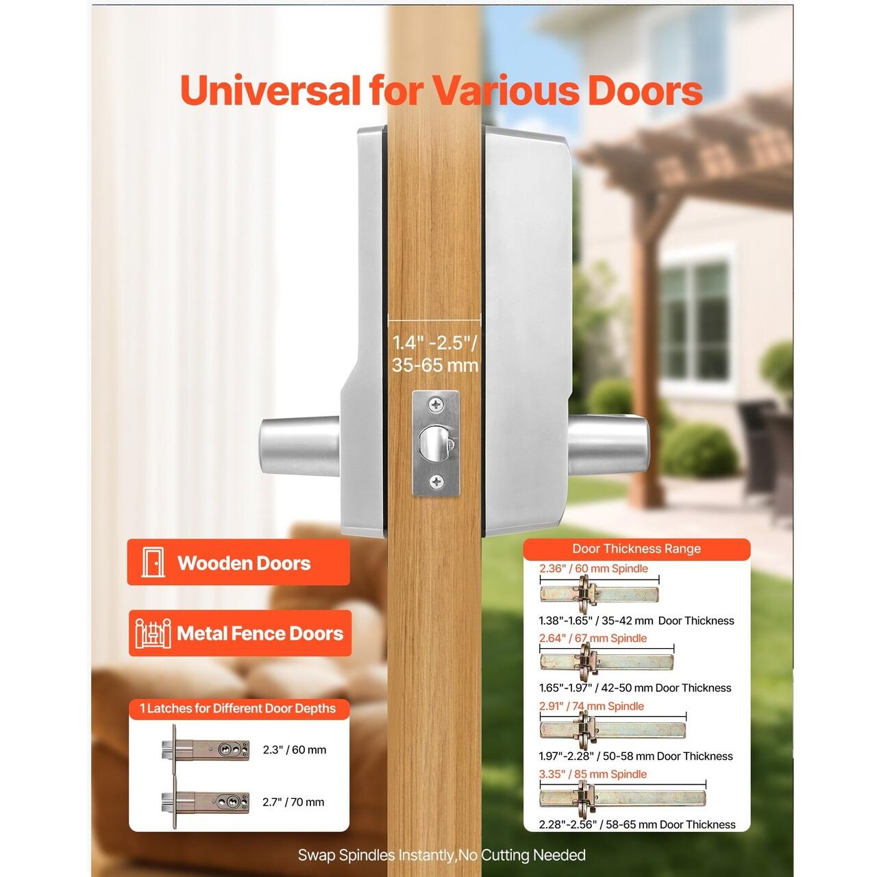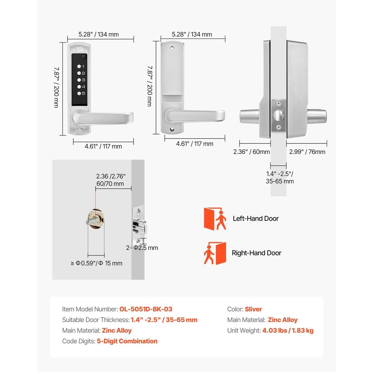 Compatibil cu mai multe tipuri de usi: Aceasta incuietoare mecanica fara cheie este dotata cu 4 axe (compatibila cu usi cu grosimea de 35-65 mm) si 2 dimensiuni de zavor (60 mm si 70 mm) pentru adancimi variate ale usilor. Incuietoarea poate fi montata atat pe usile de stanga, cat si pe cele de dreapta.