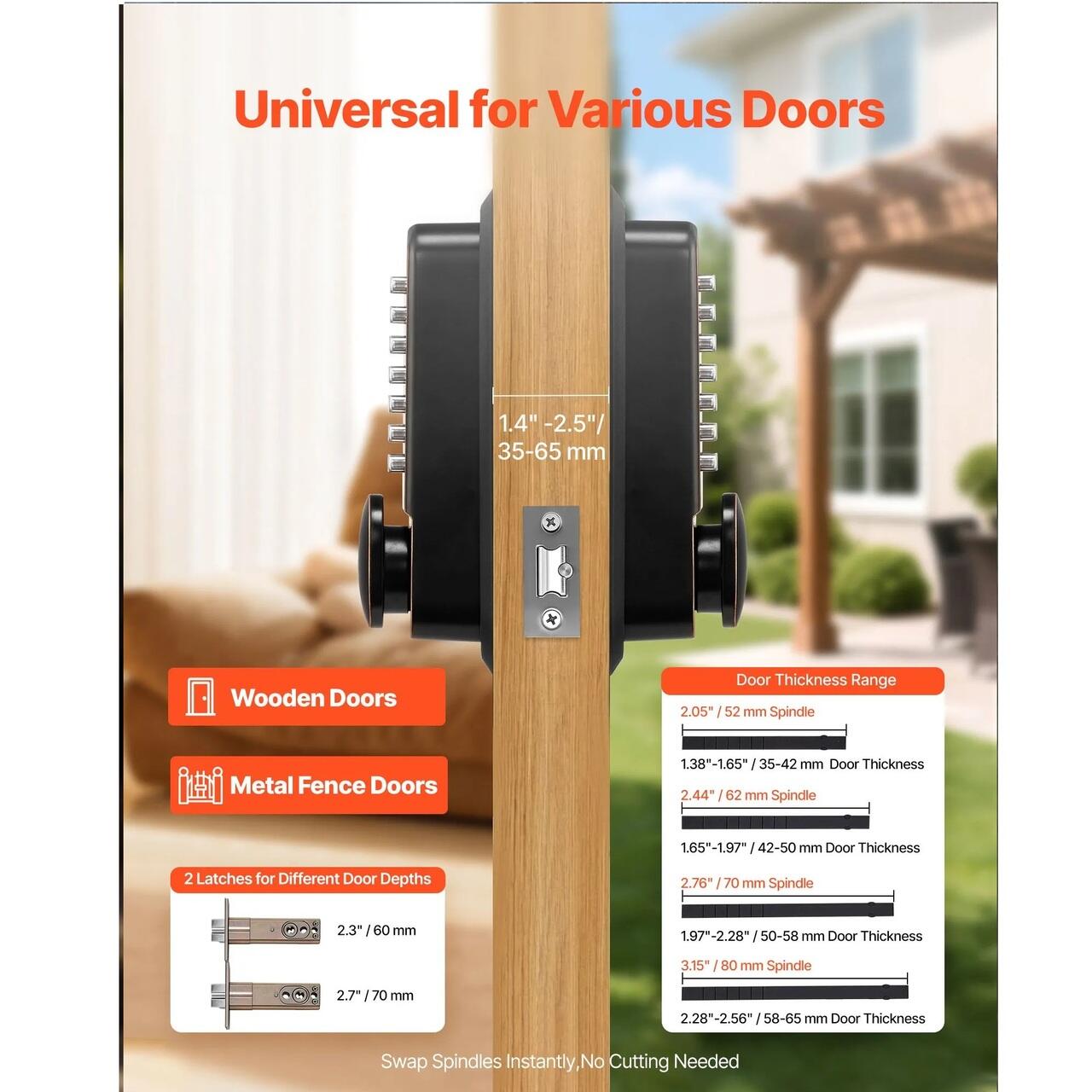 Compatibil cu mai multe tipuri de usi: Aceasta incuietoare mecanica fara cheie este dotata cu 4 axe (se potriveste cu grosimi de usi de 35-65 mm) si 2 dimensiuni de zavoare (60 mm si 70 mm) pentru adancimi variate ale usilor. Este compatibila cu usile metalice pentru garduri si usile din lemn.